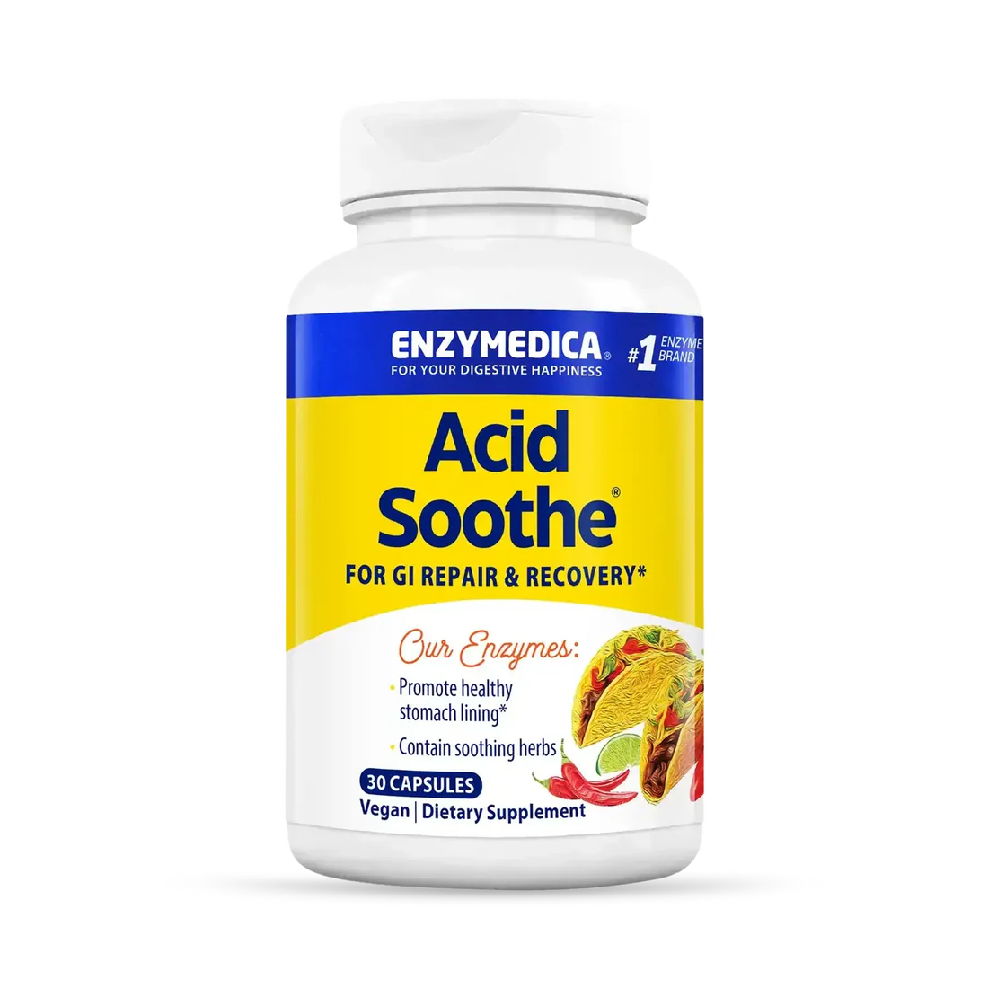 Acid Soothe contains a blend of soothing herbs that help calm the esophageal lining and reduce heartburn discomfort. The enzyme blend aids in the digestion of fiber, carbohydrates, and fats, while zinc carnosine helps promote the integrity of the stomach lining. This formula supports digestion by maintaining optimal stomach acid levels and provides relief from occasional acid-related irritation.