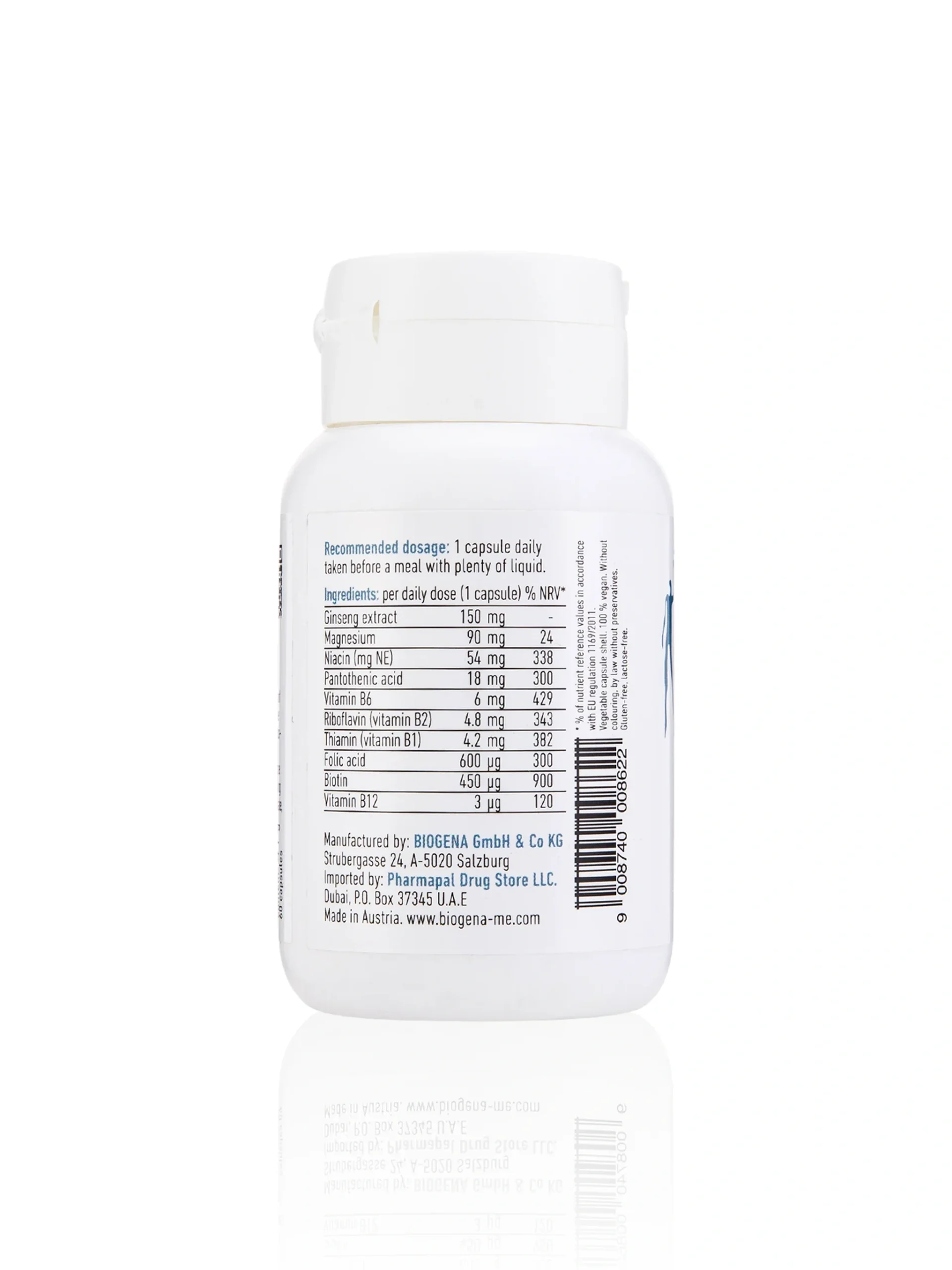 Ginseng extract, magnesium citrate, magnesium oxide, hydroxypropylmethylcellulose (capsule shell), bulking agent: cellulose powder, magnesium gluconate, magnesium carbonate, nicotinamide, calcium-D-pantothenate, pyridoxine hydrochloride, thiamine mononitrate, riboflavin, folic acid, D-biotin, hydroxocobalamin.
