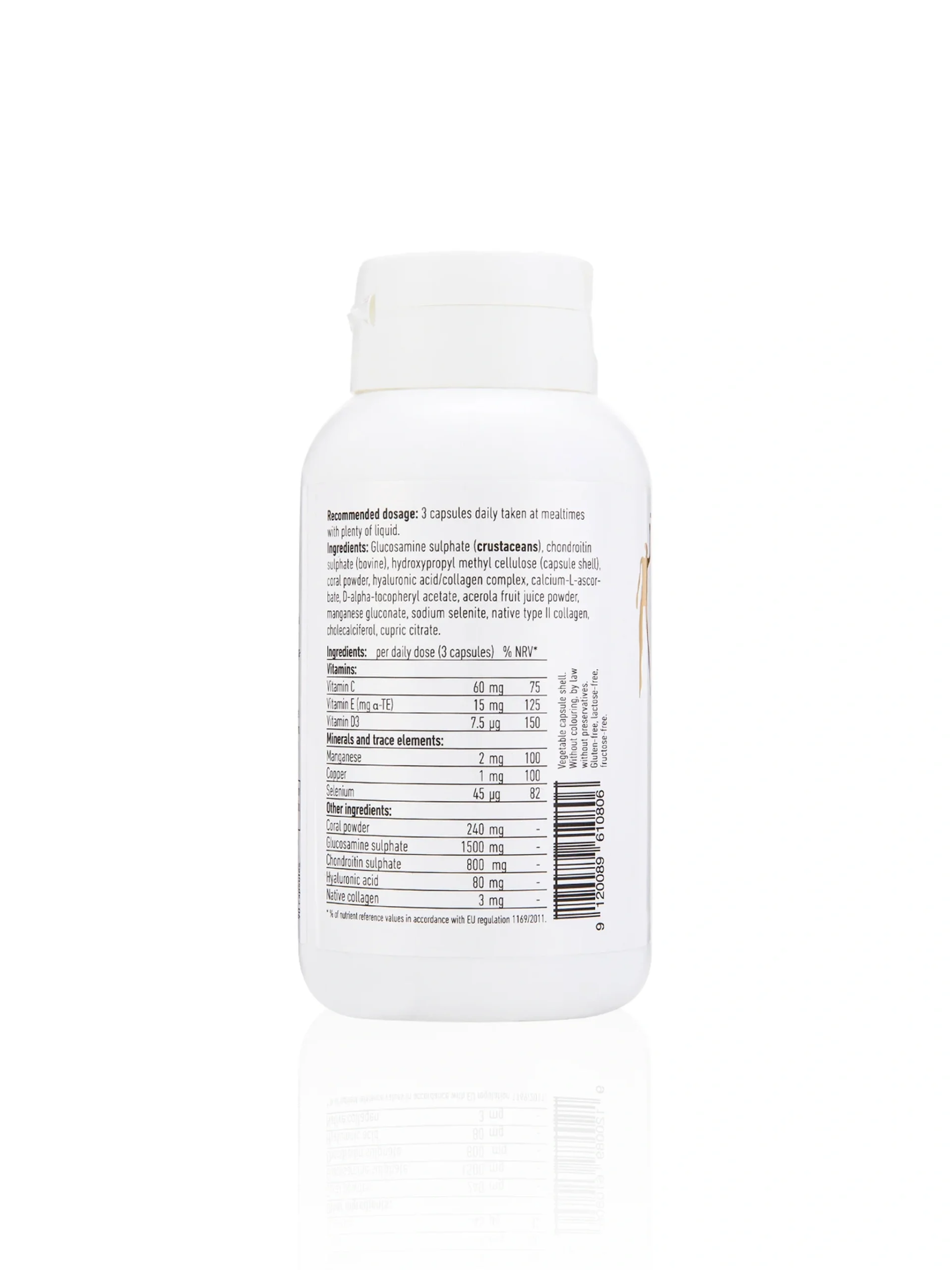 Glucosamine sulphate (crustaceans), chondroitin sulfate (bovine), hydroxypropylmethylcellulose (capsule shell), coral powder, hyaluronic acid-collagen complex, calcium-L-ascorbate, D-alpha tocopheryl acetate, acerola fruit juice powder, manganese gluconate, sodium selenite, native type II collagen, cholecalciferol, cupric citrate.