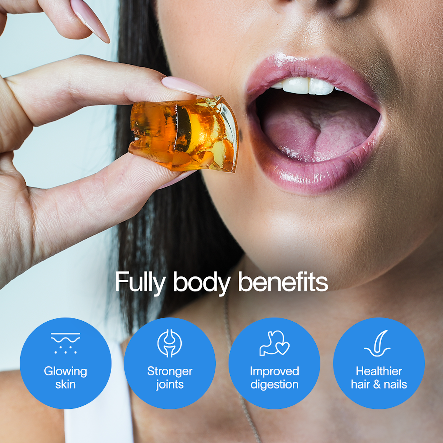 • Rapidly absorbed bioactive collagen for skin, hair, nail, gut, and joint health