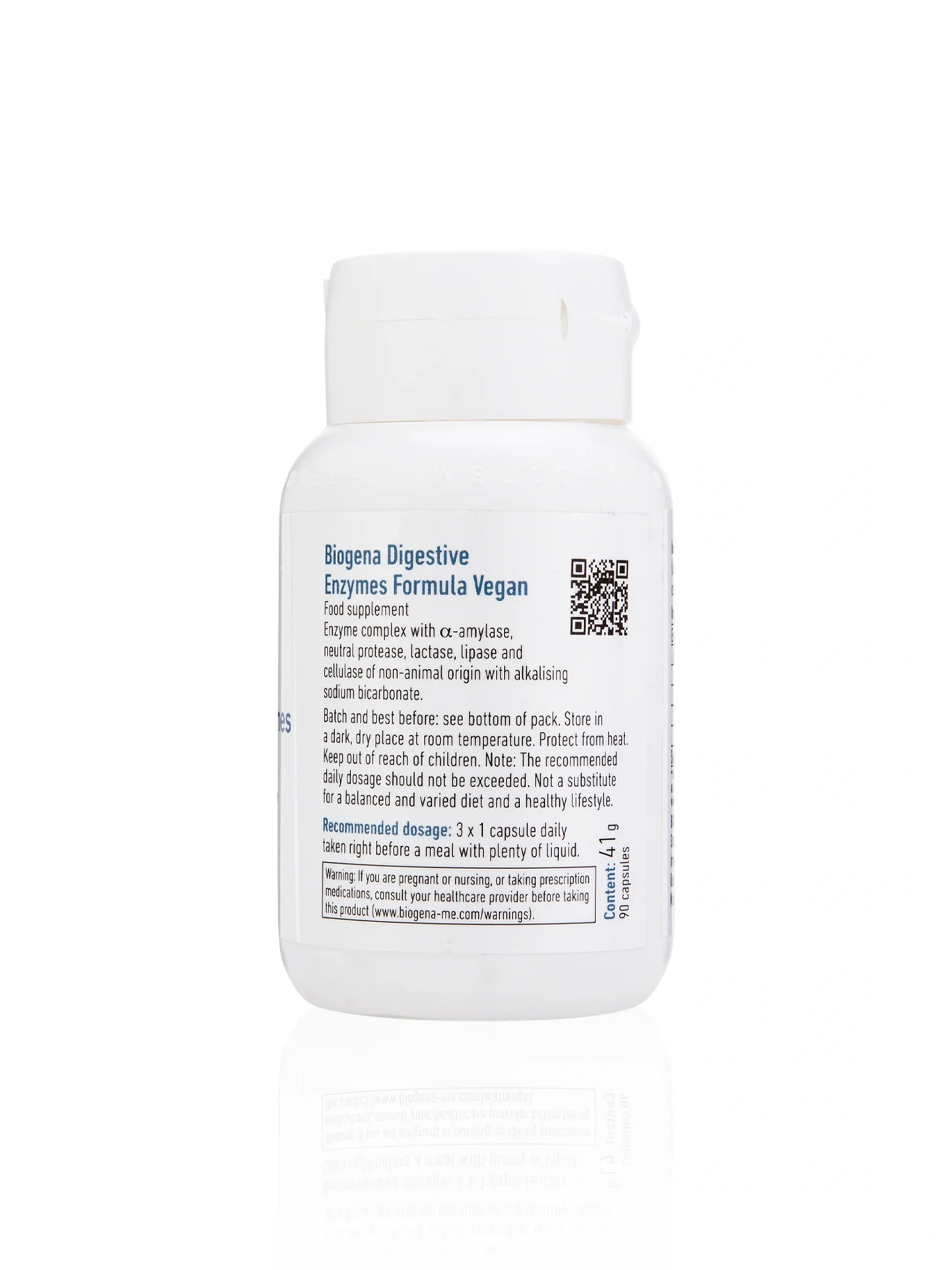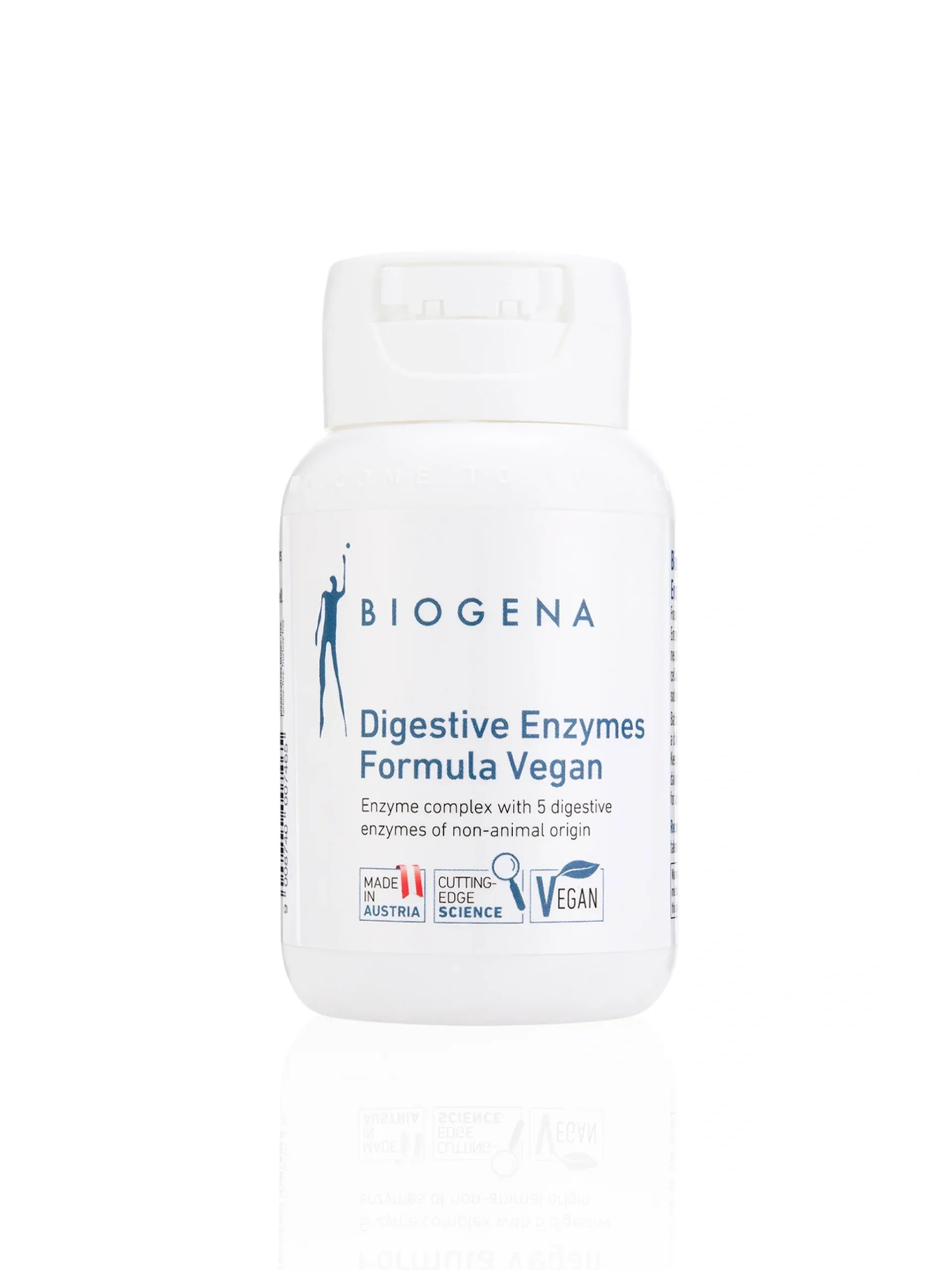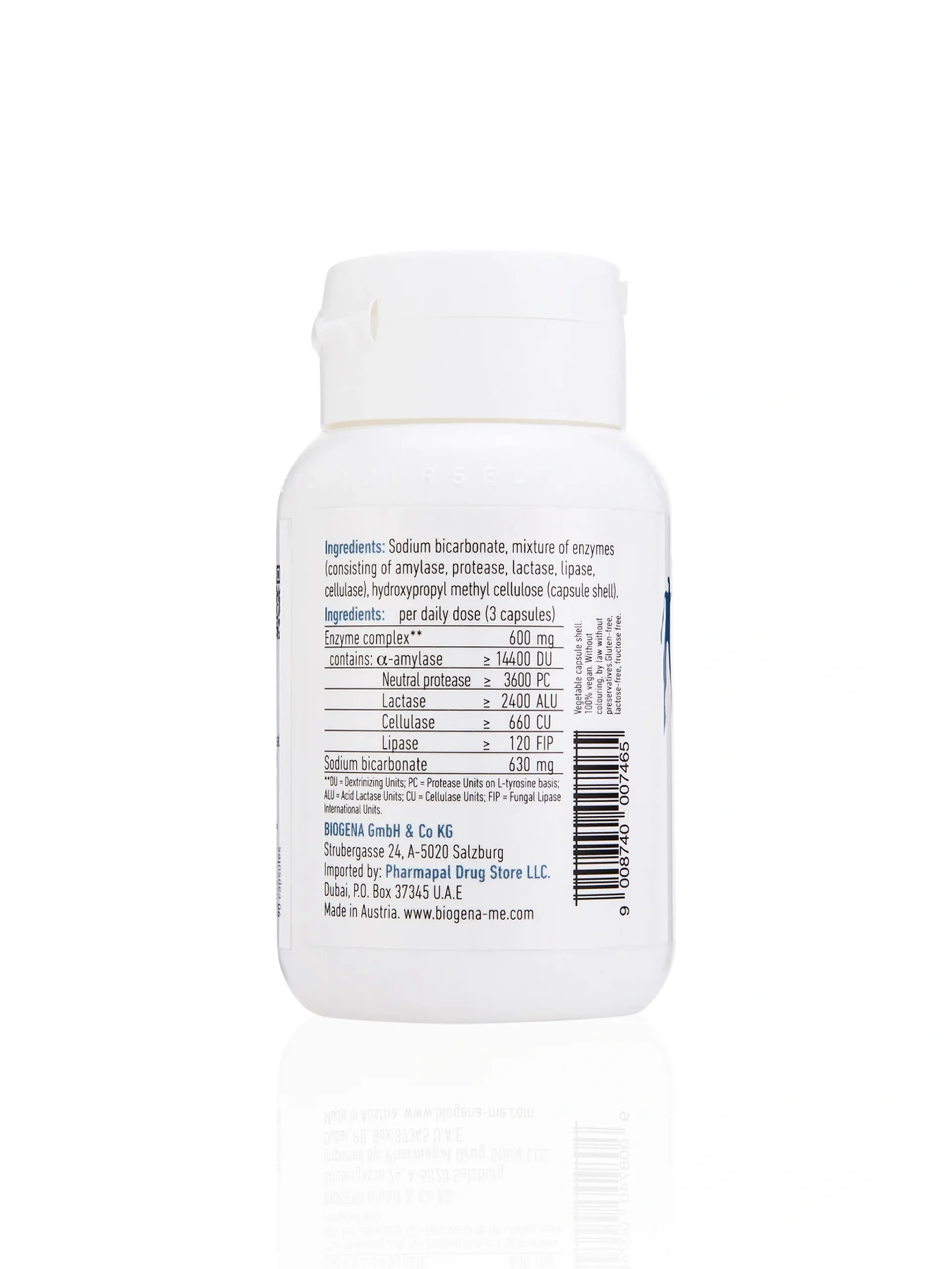 Biogena Digestive Enzymes Vegan (DigestioCym 200) is formulated to support optimal digestive function by supplementing key enzymes that the body may lack, particularly during large meals or dietary changes. The mixture includes plant-based alpha-amylase, protease, lactase, lipase, and cellulase, along with sodium bicarbonate for gut pH support. This non-animal formula helps breakdown a wide range of foods—proteins, fats, carbs, lactose, and plant fibers—reducing bloating, gas, and discomfort while improving nutrient absorption.