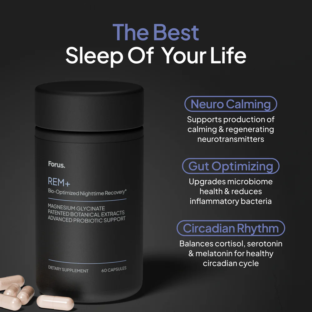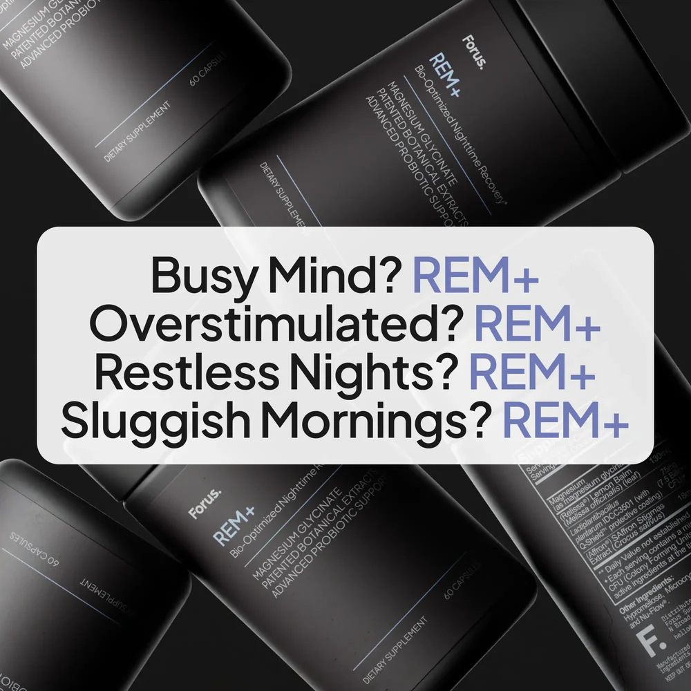 REM+ is a nighttime supplement designed to support deep sleep, body recovery, gut health, and mood through a blend of highly absorbable magnesium, plant extracts, and probiotics.