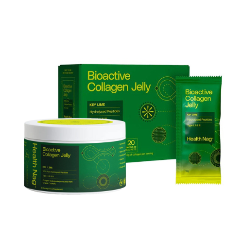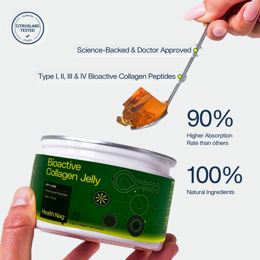 Convenient single-serve jelly sachets with bioactive collagen types I, II & III in a zesty key lime flavor, ideal for on‑the‑go skin, joint, and gut support.