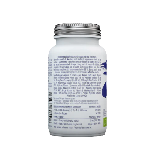 A vegan immune-support supplement based on organic powders from five medicinal mushrooms, enriched with natural vitamin C (acerola) and vitamin D (lichen), plus prebiotic fiber, designed to support immune and gut health.