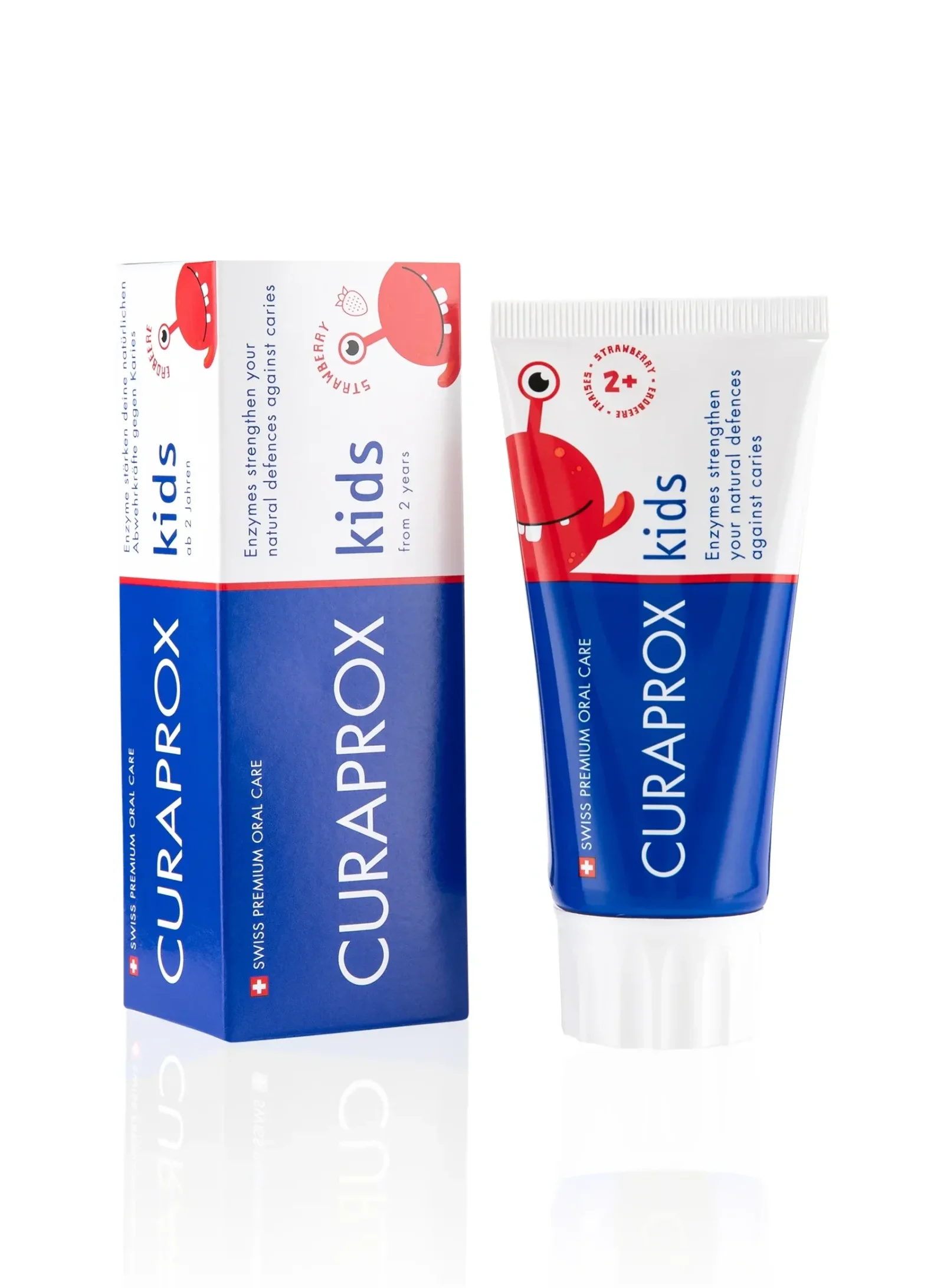 Children’s toothpaste with fresh and fruity strawberry flavour. Fun flavour, Happy kids, Gentle on young teeth, Fights cavities, boosts health.