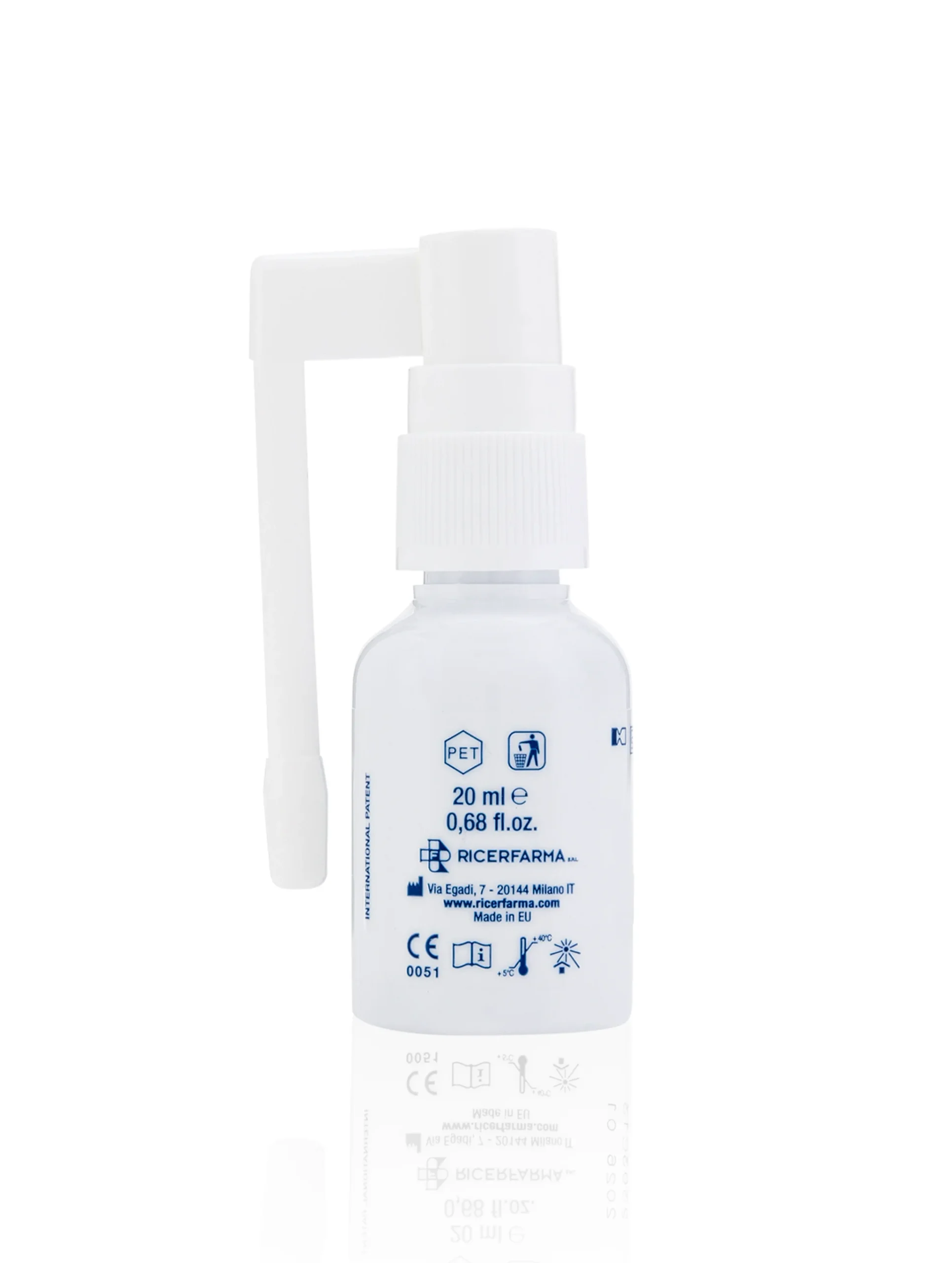 Offers the maximum practicality and ease of use. Light and convenient, it can be carried around anywhere, and its multidirectional pump allows easy, precise application to the affected area. Particularly suitable in the case of mouth ulcers with a mechanical cause, where direct application of a product is often impossible due to pain.