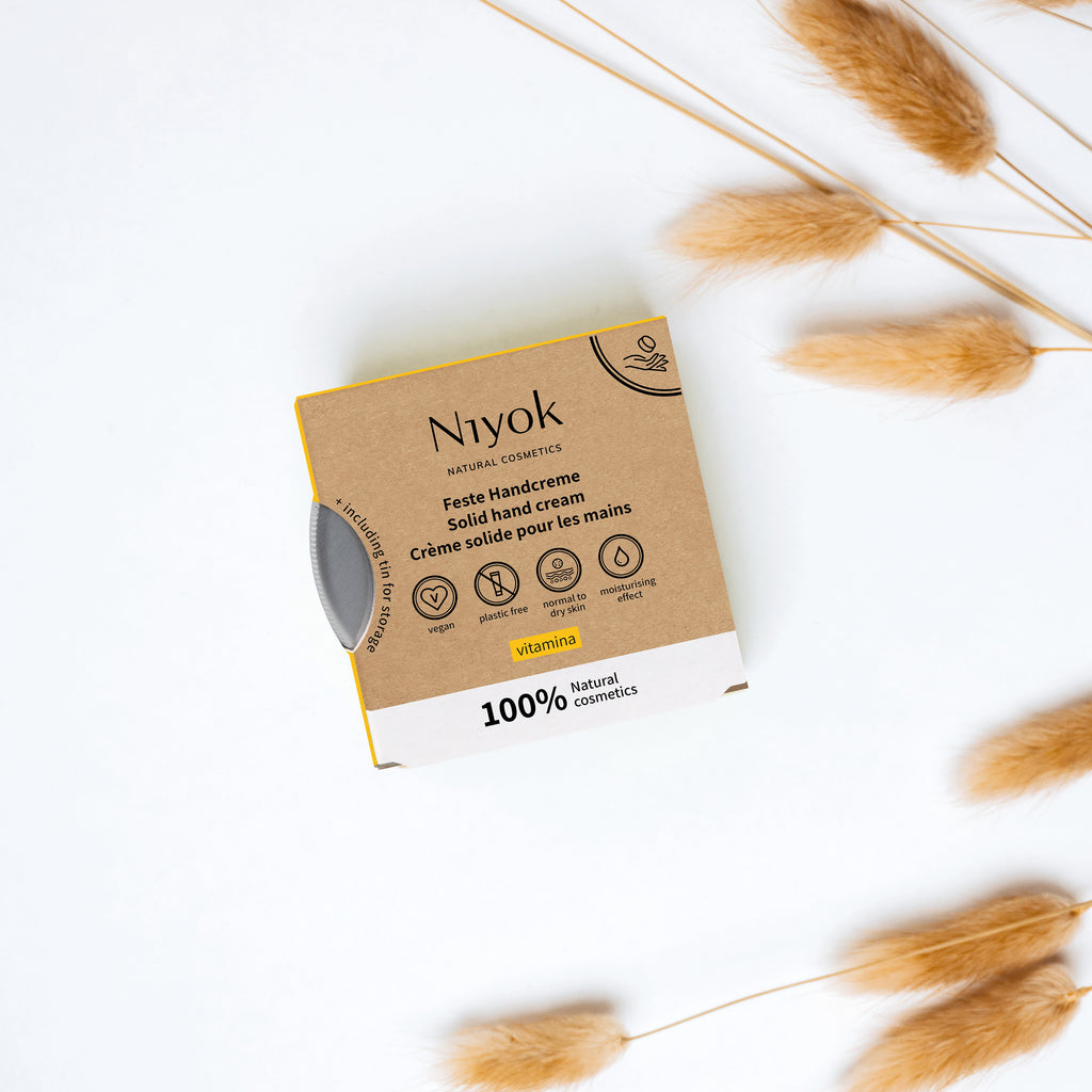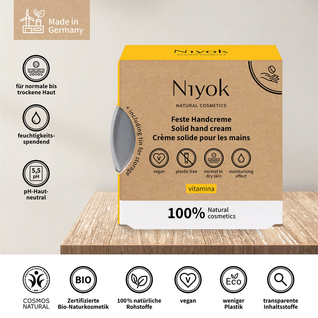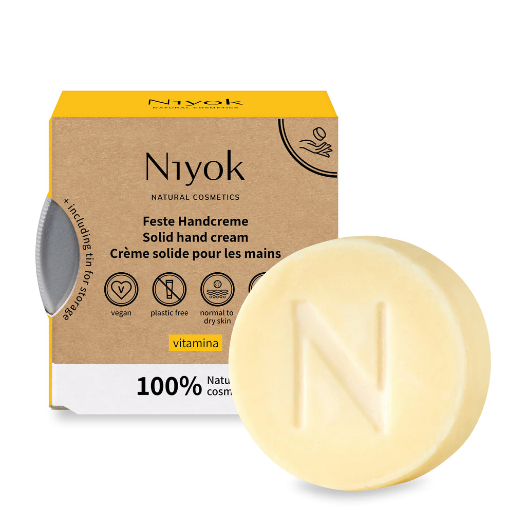Solid, plastic-free hand cream with a fruity-fresh “Vitamina” scent. Rich in nourishment and ideal for dry hands. Vegan and COSMOS-certified.