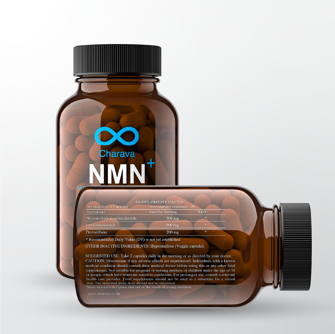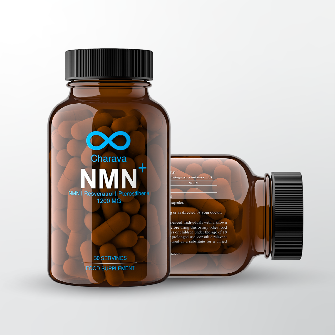 Charava NMN+1200 combines three powerful longevity molecules, Nicotinamide Mononucleotide (NMN), Resveratrol, and Pterostilbene, to support cellular health, energy, and slowed ageing.