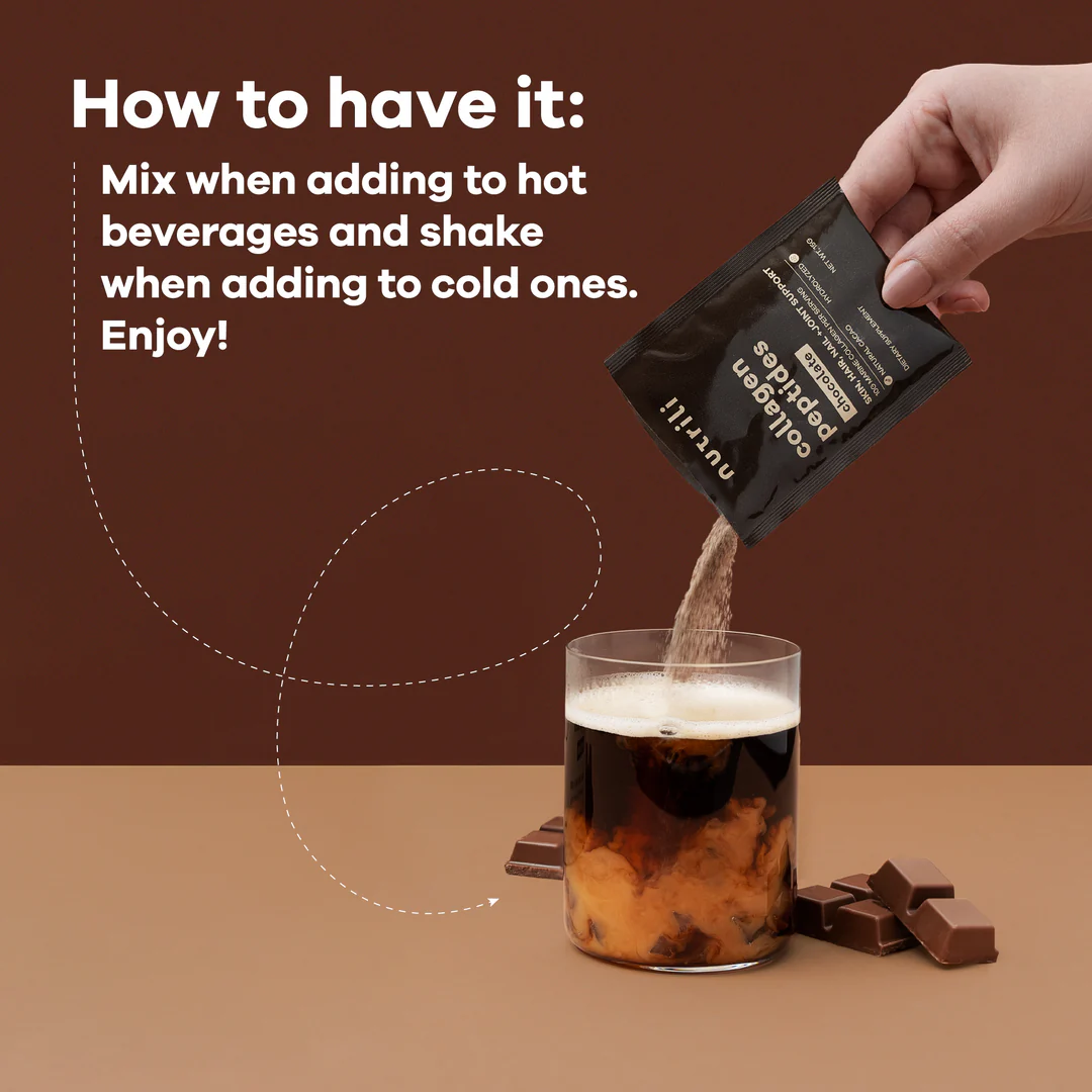 Chocolate-flavored marine collagen powder with 10 g of hydrolyzed collagen per sachet, supporting healthy skin, hair, nails, and joints.
