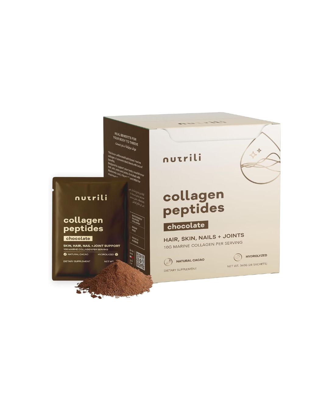 Nutrili Chocolate Collagen Peptides offers 10 grams of high-quality hydrolyzed marine collagen (types I & III) in every sachet. Sourced from wild-caught fish, it’s designed for excellent absorption and effectiveness. The formula includes prebiotic chicory inulin to support gut health and collagen synthesis. With a smooth natural chocolate taste, this supplement helps improve skin firmness, hair strength, nail health, and joint flexibility. It’s sugar-free, easy to mix, and a delicious addition to your daily beauty routine.