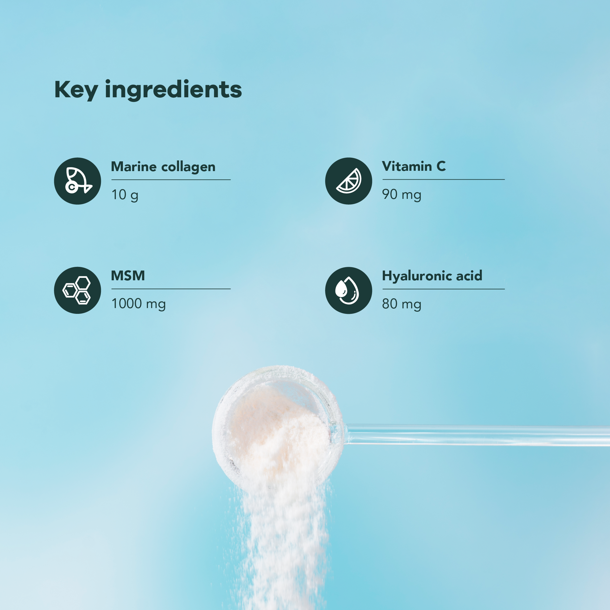 Each serving (1 sachet) contains: Hydrolyzed marine collagen (Type I & III) – 10 g MSM (Methylsulfonylmethane) – 1,000 mg Vitamin C (Ascorbic Acid) – 90 mg Hyaluronic Acid – quantity not specified Other ingredients: natural stabilizers and flow agents. No flavor, sugar, or artificial colorings added.