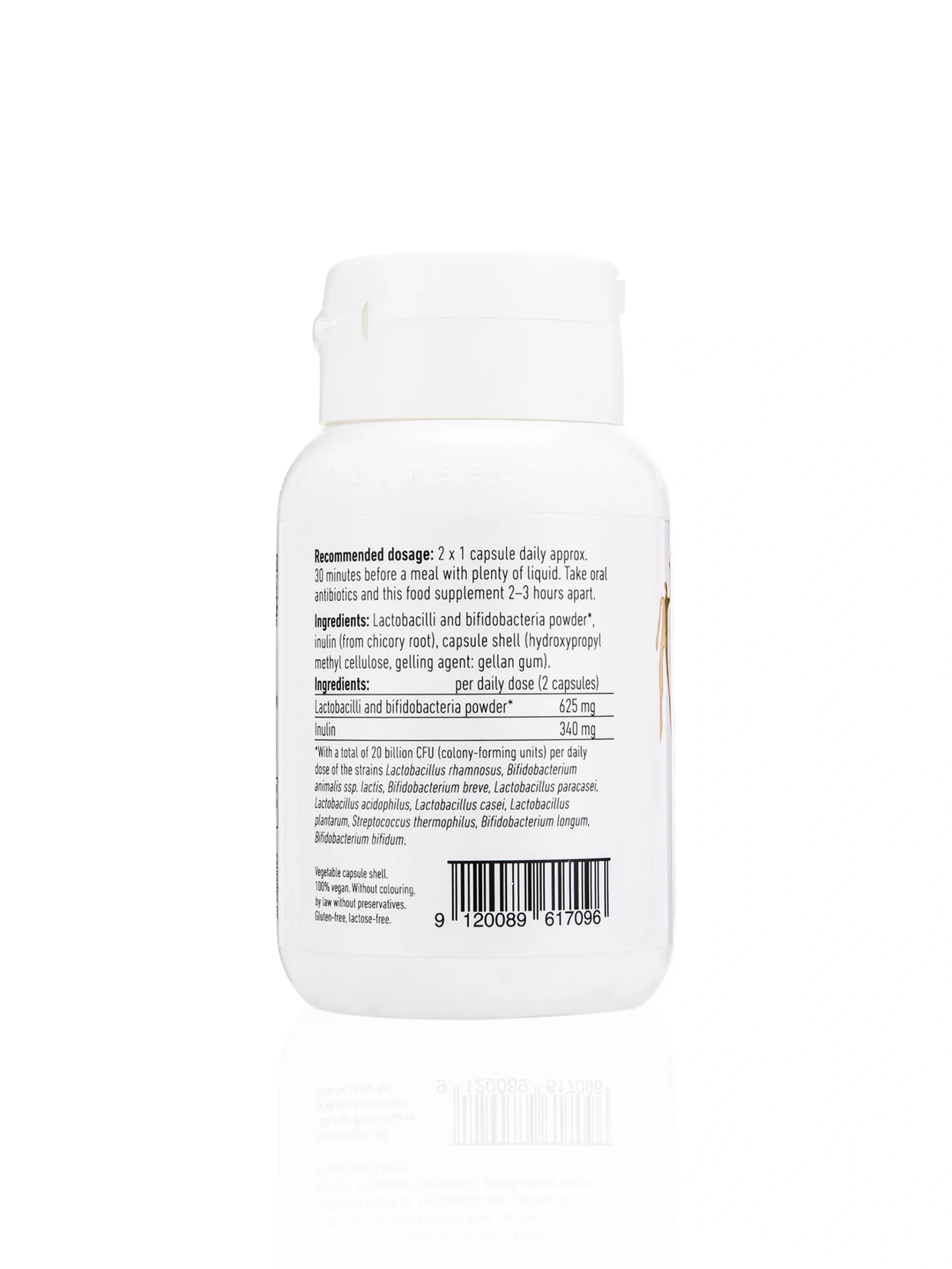 High potency synbiotic capsule delivering 20 billion CFU per day from 10 scientifically studied probiotic strains, combined with inulin to support gut health and overall well-being.