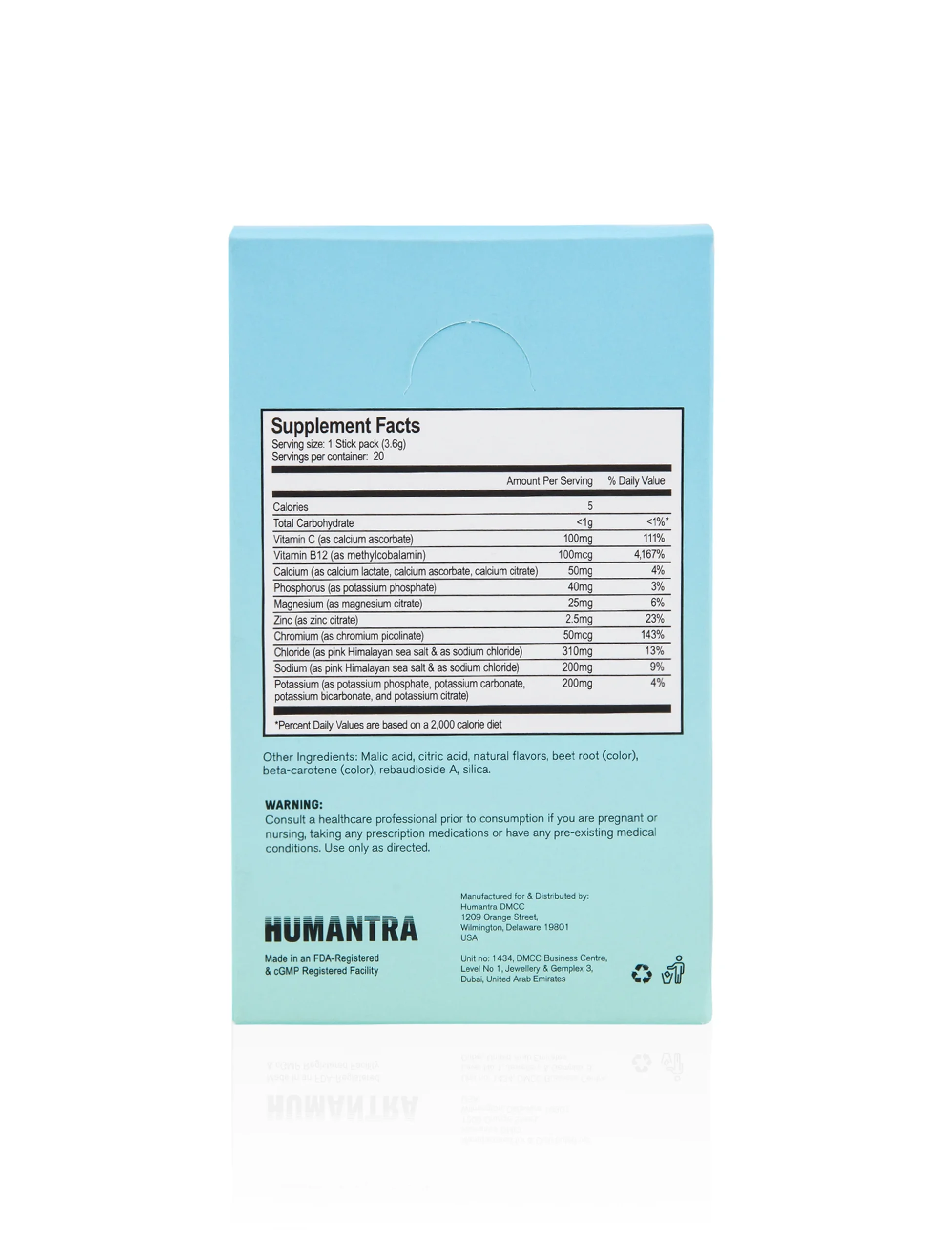 Calcium (Citrate) 50mg Phosphorus (Phospate) 40mg Magnesium (Citrate) 25mg Zinc (Citrate) 2.5mg Chromium (Picolinate) 50mcg Chloride (Pink Himalayan sea salt & sodium chloride) 310mg Sodium (Pink Himalayan sea salt & sodium chloride) 200mg Potassium (Citrate) 200mg Vitamin C 100mg Vitamin B12 100mcg Natural Sweetener (Stevia Leaf Extract, Rebaudioside A) Natural Coloring (Beta-Carotene and Beetroot Powder)