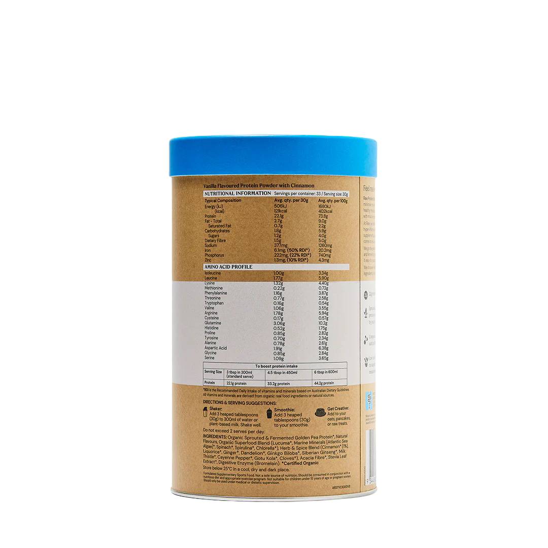 Organic sprouted & fermented golden pea protein Natural flavours Organic lucuma Sea mineral complex (74+ trace minerals) Spinach Spirulina Chlorella Herb & spice blend: cinnamon, liquorice, ginger, dandelion, ginkgo biloba, Siberian ginseng, milk thistle, gotu kola, cayenne pepper, cloves Organic acacia gum Organic stevia leaf extract Digestive enzyme (bromelain)