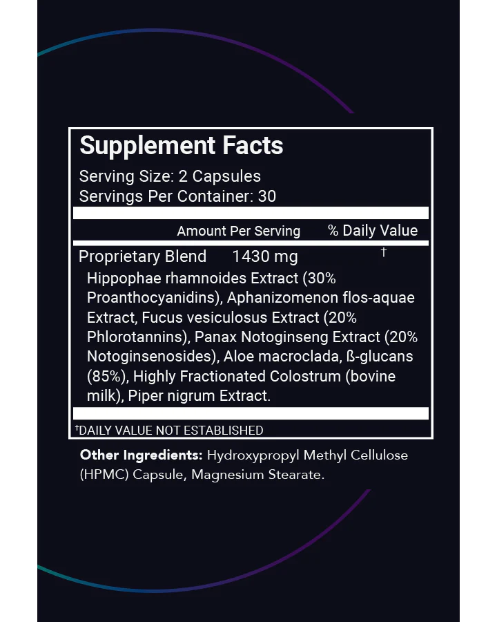 Proprietary Blend – 1430 mg † Hippophae rhamnoides Extract (30% Proanthocyanidins) Aphanizomenon flos-aquae Extract Fucus vesiculosus Extract (20% Phlorotannins) Panax Notoginseng Extract (20% Notoginsenosides) Aloe macroclada ß-glucans (85%) Highly Fractionated Colostrum (bovine milk) Piper nigrum Extract † Daily Value Not Established Other Ingredients: Hydroxypropyl Methyl Cellulose (HPMC) Capsule, Magnesium Stearate.