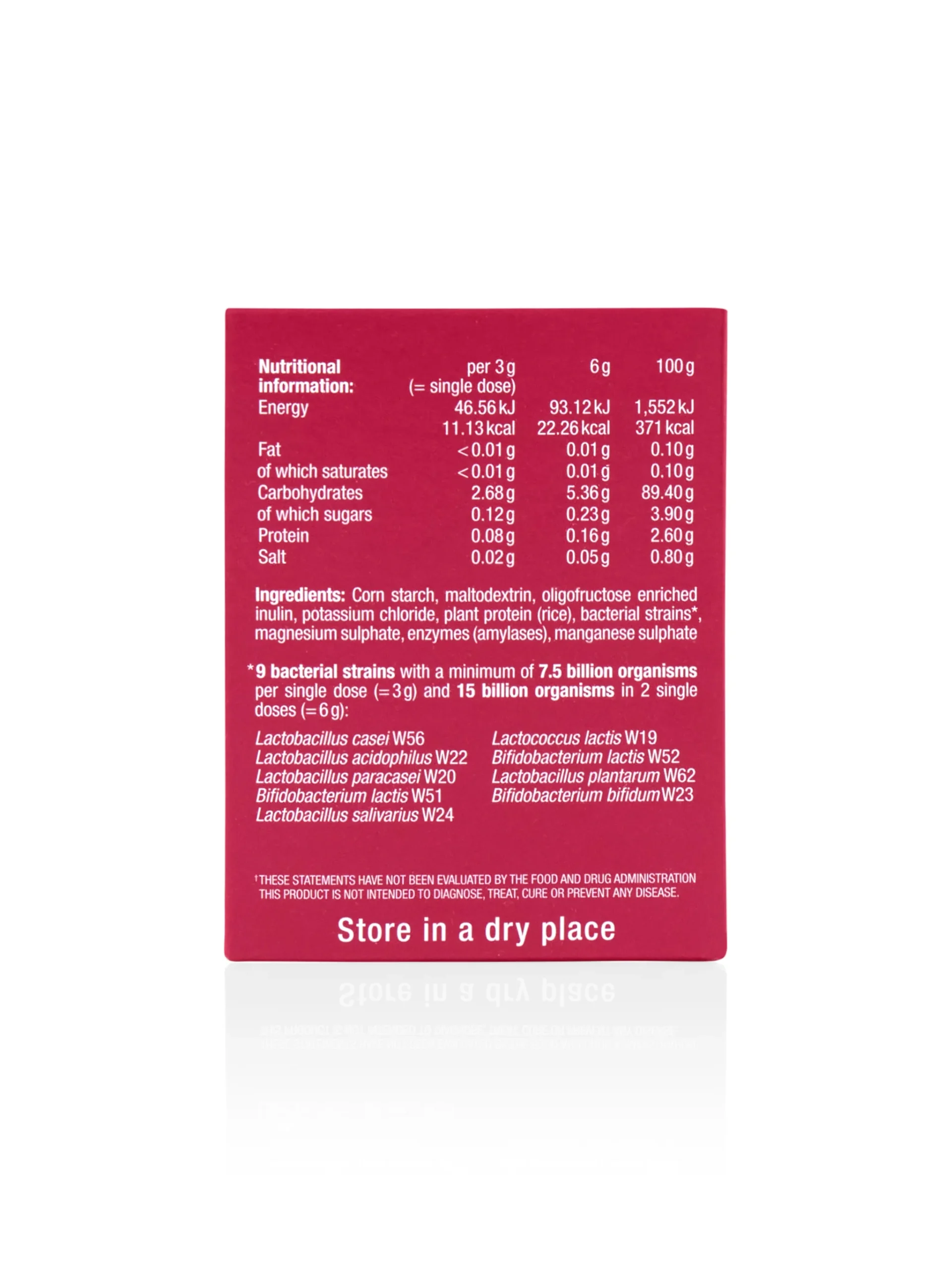 Corn starch, maltodextrin, inulin, potassium chloride, rice protein, bacterial strains*, magnesium sulphate, fructo-oligosaccharides (FOS), enzymes (amylases), manganese sulphate *9 human bacterial strains with at least 7.5 billion organisms per 1 portion (= 3 g) and 15 billion organisms per 2 portions (= 6 g): Lactobacillus casei W56 Lactobacillus acidophilus W22 Lactobacillus paracasei W20 Bifidobacterium lactis W51 Lactobacillus salivarius W24 Lactococcus lactis W19 Bifidobacterium lactis W52 Lactobacillus plantarum W62 Bifidobacterium bifidum W23 Contains no animal protein, gluten, yeast, or lactose. Suitable for those allergic to milk, children, also during pregnancy/breastfeeding.