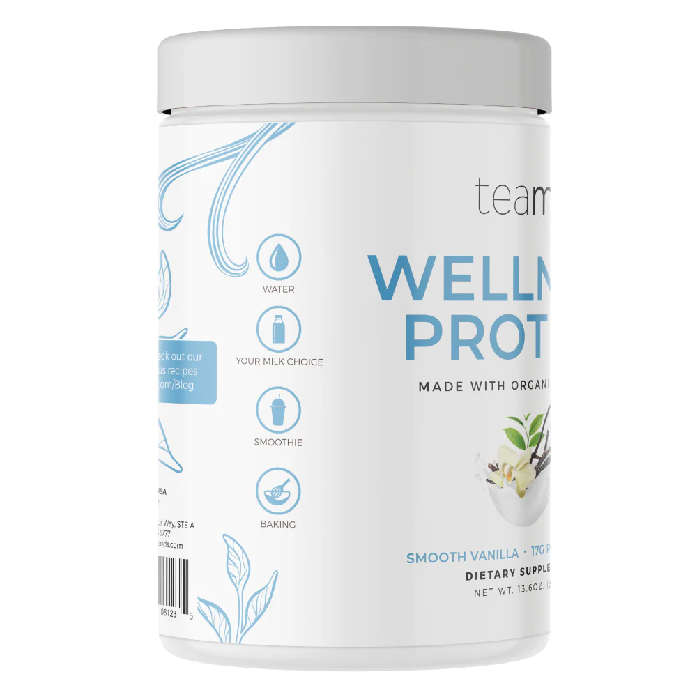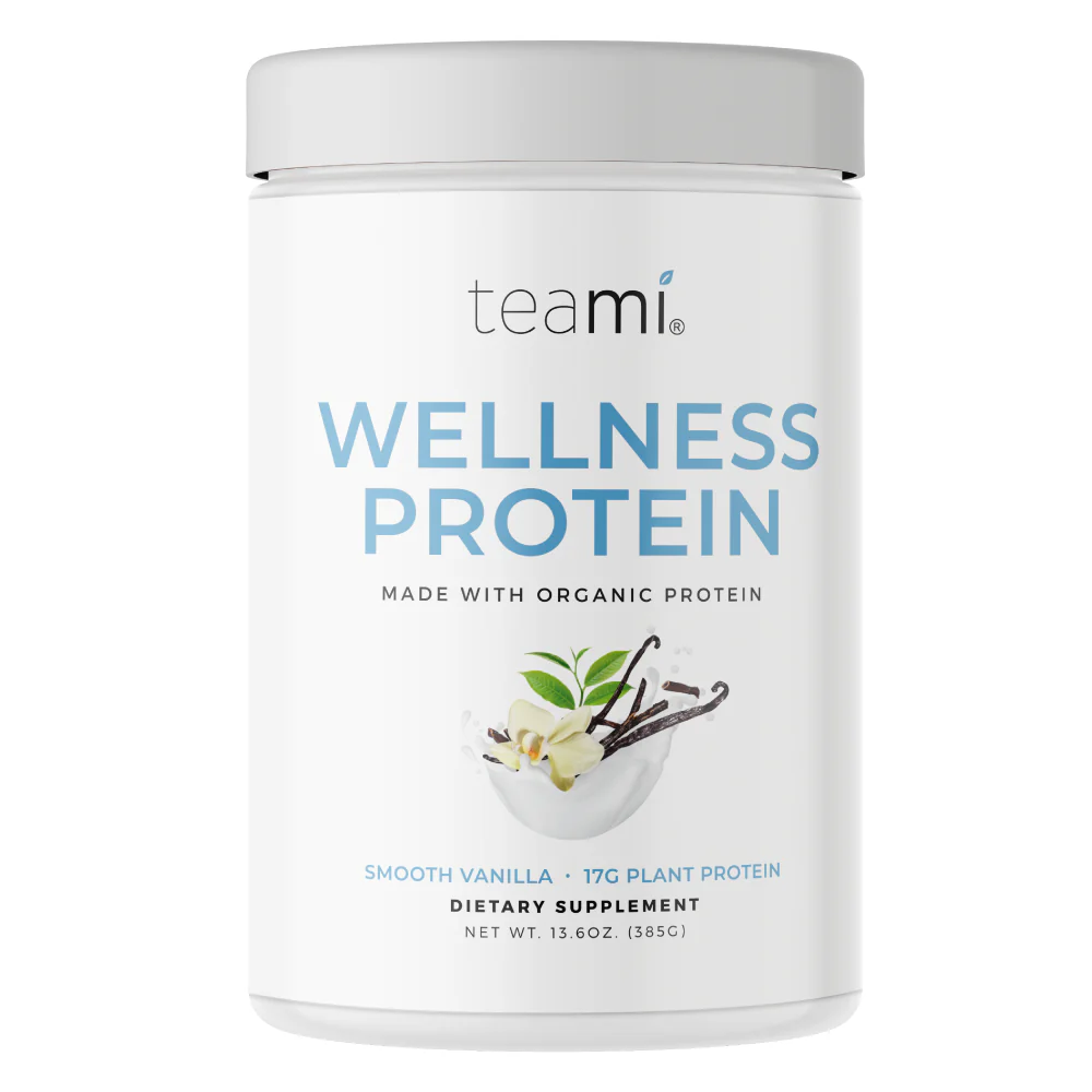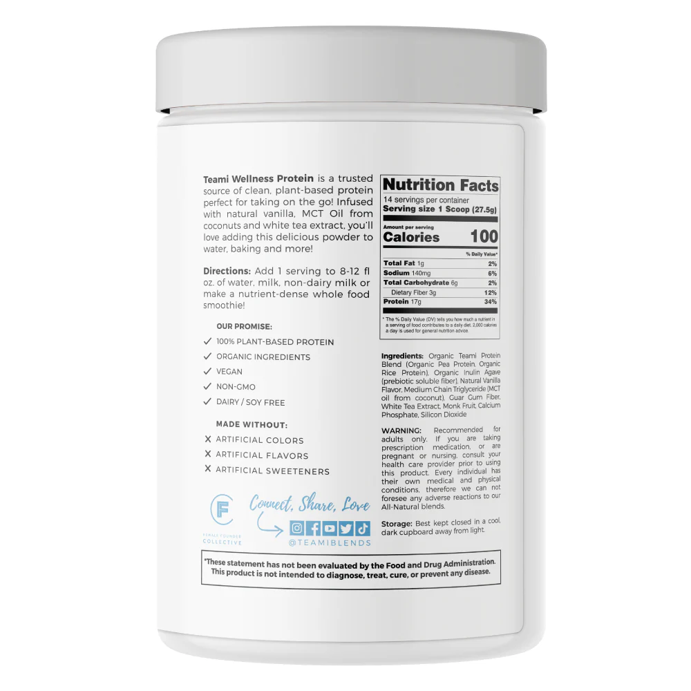 Organic Teami Protein Blend (Organic Pea Protein, Organic Rice Protein) Organic Inulin Agave (prebiotic fiber) Natural Vanilla Flavor Medium Chain Triglyceride (MCT) Oil from Coconut Guar Gum Fiber White Tea Extract Monk Fruit (natural sweetener) Calcium Phosphate Silicon Dioxide (anti-caking agent)