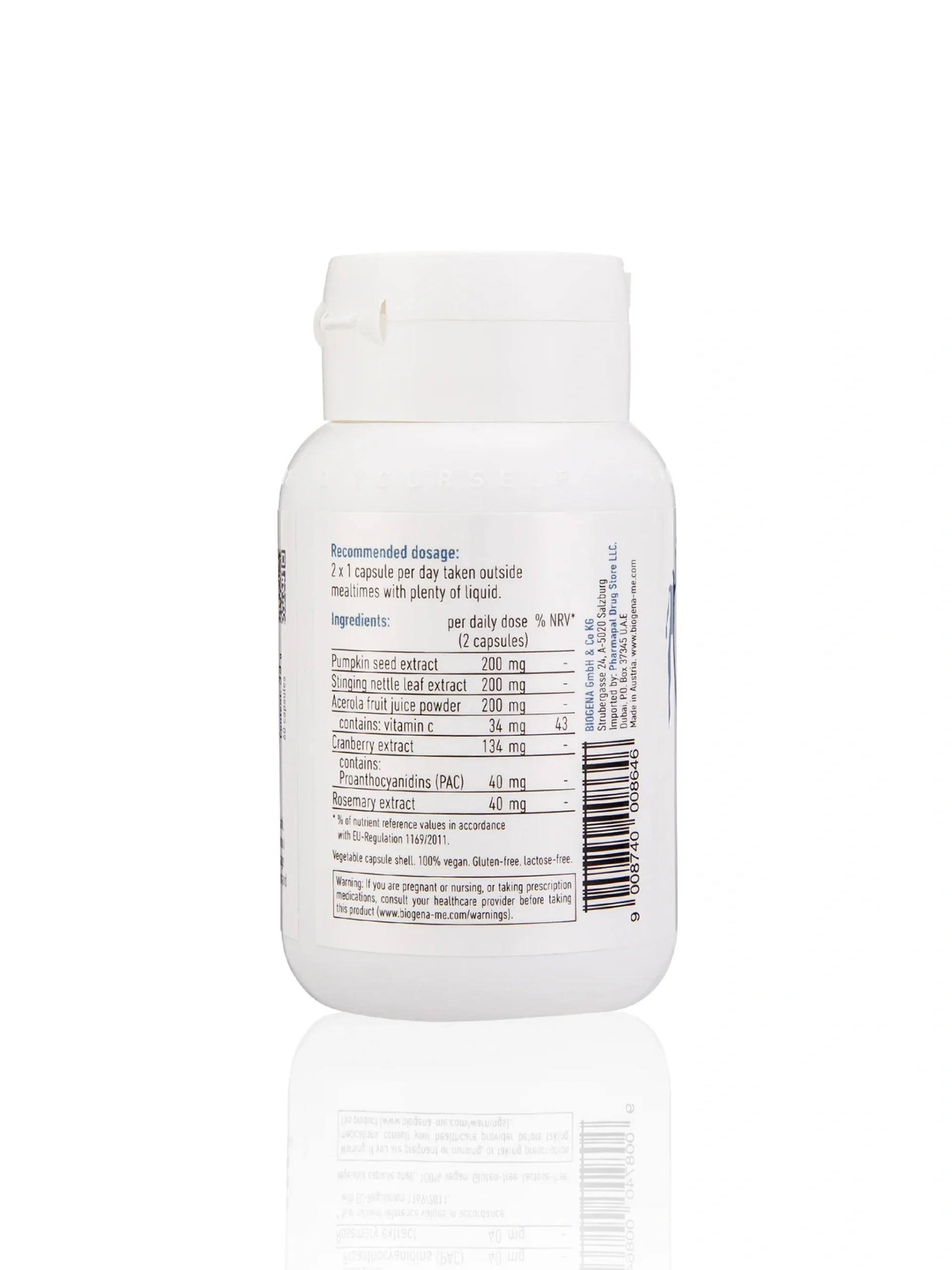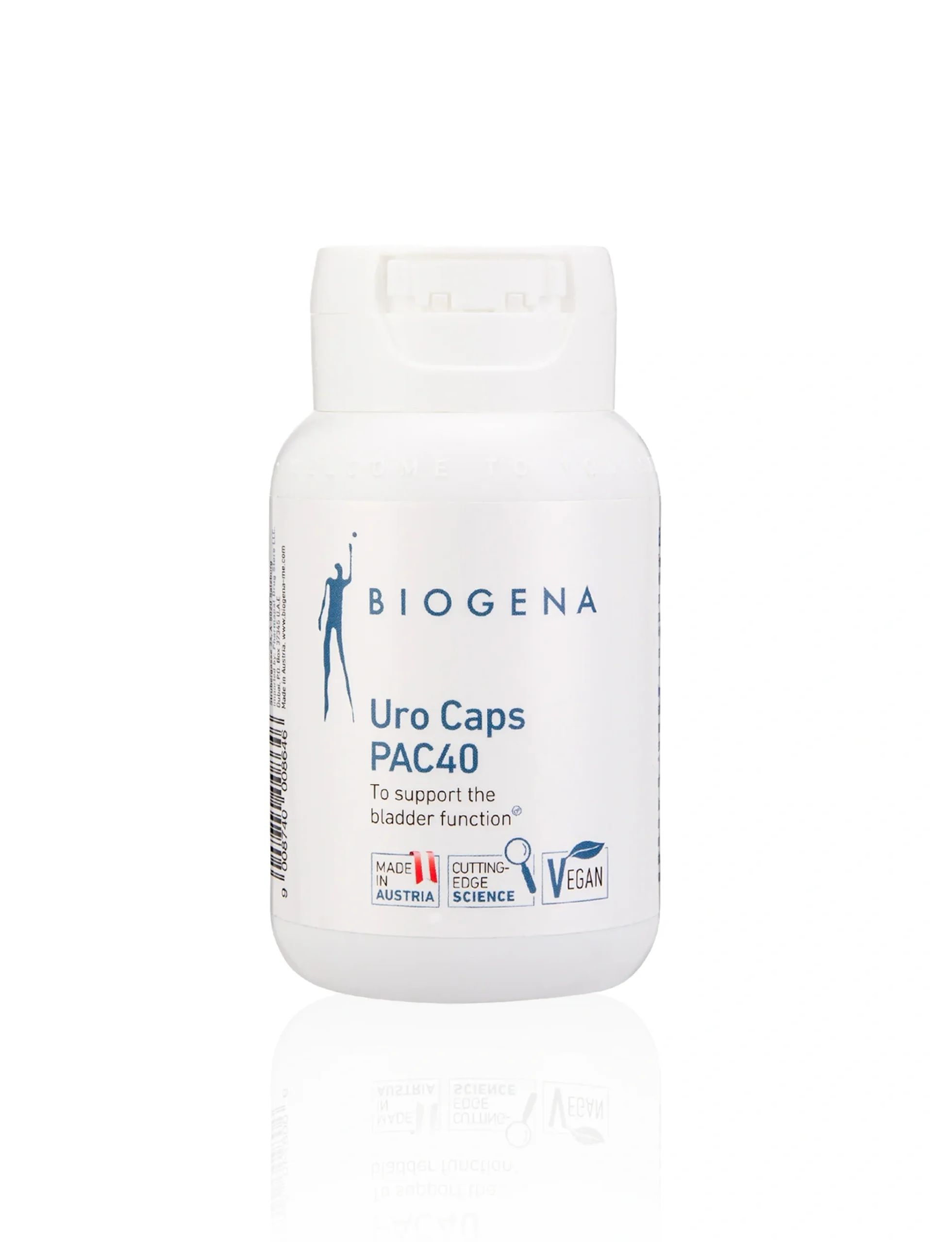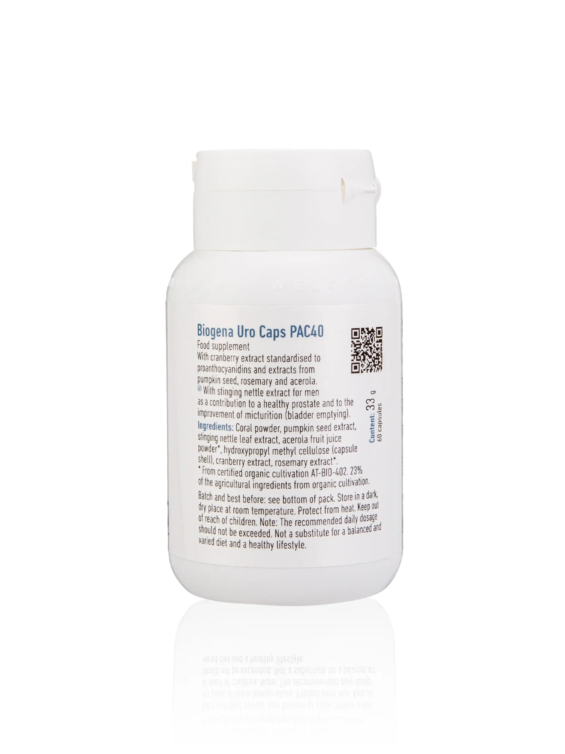 Biogena Uro Caps PAC40 is a herbal complex containing cranberry, pumpkin seed, rosemary, acerola, and nettle, formulated to support bladder function, promote urinary comfort, and help maintain normal urinary flow.